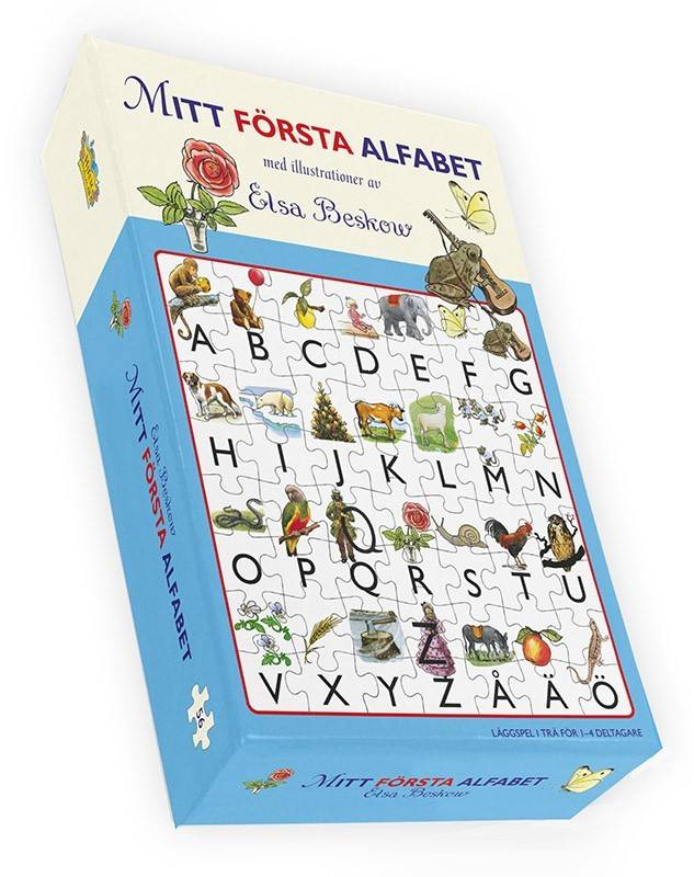 Träpussel med 56 bitar som introducerar alfabetet, illustrerat med motiv från Elsa Beskows klassiska bilder.