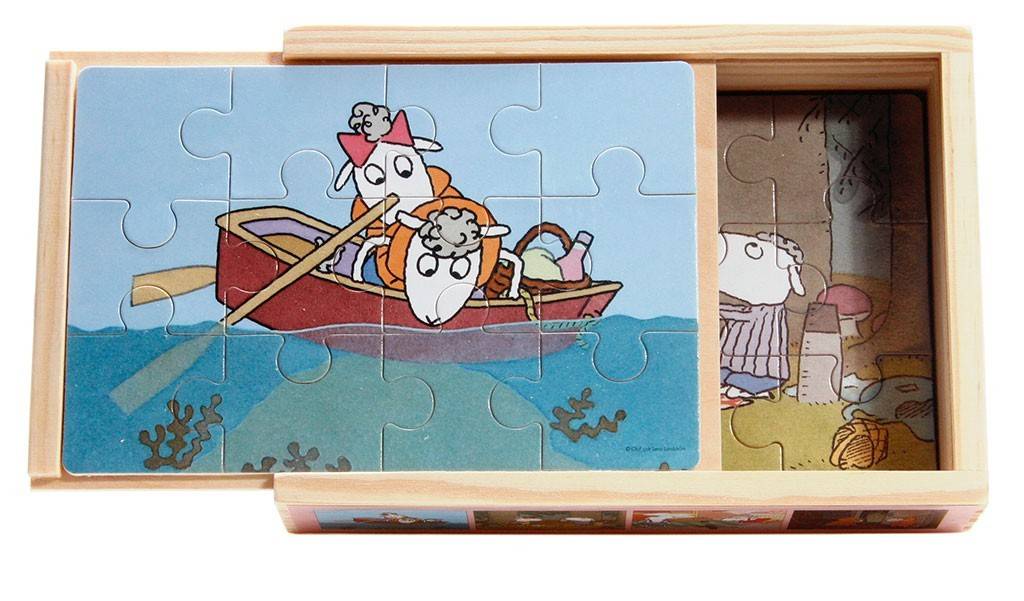 Trälåda med fyra träpussel, vardera med 12 bitar och mått 12 x 17 cm. Motiven visar de älskade fåren Bu och Bä, skapade av Olof och Lena Landström.