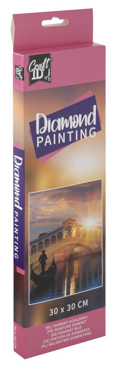 Måla ett Venedigmotiv på 30x30 cm med Diamond painting. Diamantmålning kombinerar pärlande, korsstygn och färgläggning med högsta precision när de små glänsande diamantformade plastbitarna ska placeras på den förlimmade duken. Pärla ett vackert, glänsande Venedigmotiv!
