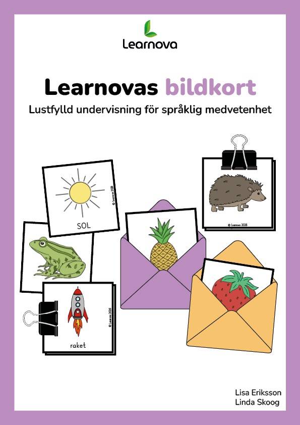 Learnovas bildkort – Lustfylld undervisning för språklig medvetenhet Att upptäcka språkljud och förstå hur ord är uppbyggda är en central del i utvecklingen av de yngsta elevernas språkliga medvetenhet. När elever får lyssna på språkets ljud, resonera om ord och undersöka hur språket fungerar tillsammans utvecklar de steg för steg sin förståelse för språkets byggstenar. Learnovas bildkort är framtagna för att stödja detta arbete i undervisningen. Materialet innehåller över 300 bildkort i färg och 82 lektionsförslag som tillsammans skapar en tydlig struktur i arbetet med språkljud och språklig medvetenhet. Bildkorten fungerar som ett visuellt stöd som väcker nyfikenhet, skapar samtal och gör det möjligt för elever att tillsammans utforska språkets ljud och ord. Varje bildkort finns i sju olika varianter. Förutom små bildkort finns mellanstora och stora bildkort både utan text och med text i två varianter, versaler och gemener. Det gör det möjligt att använda samma bildkort i flera undervisningssituationer och att anpassa arbetet efter elevernas behov. Små bildkort lämpar sig väl i spel och aktiviteter vid elevernas bänkar. Mellanstora bildkort fungerar i de flesta övningar i klassrummet, medan stora bildkort är särskilt användbara vid gemensamma genomgångar där hela gruppen arbetar tillsammans. Texten på bildkorten är skriven i Learnovas eget typsnitt, utformat för att följa de bokstavsformer som eleverna lär sig i skolan. Materialet är inspirerat av Bornholmsmodellen och den systematiska ljudningsmetodiken Phonics. Därför ligger fokus på fonemisk medvetenhet, en tydlig koppling mellan fonem och grafem samt en genomtänkt progression i arbetet. Bildkorten är organiserade i nivåer utifrån språklig svårighetsgrad, vilket gör det lättare att planera undervisningen och anpassa arbetet efter elevernas behov. De 82 lektionsförslagen visar hur bildkorten kan användas i arbetet med rim, sammansatta ord, fonemanalys, fonemsyntes och fonem–grafemkoppling samt som stöd i elevernas skrivande. Övningarna är utformade för att skapa variation i undervisningen samtidigt som eleverna möter språkliga moment flera gånger. Materialet är utvecklat och prövat tillsammans med elever i undervisningen och har en tydlig koppling till läroplanen. Learnovas bildkort ger pedagoger ett strukturerat stöd i arbetet med språklig medvetenhet och bidrar till undervisning där elever får utforska språk, upptäcka nya samband och utveckla sin förståelse för hur språket fungerar. Målet är undervisning som väcker nyfikenhet och tänder stjärnögon hos både elever och pedagoger.